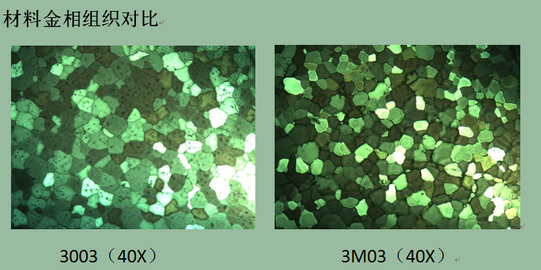 以上將3003、3M03做金相晶粒分析,通過(guò)對(duì)比,發(fā)現(xiàn)3M03合金晶粒度較3003更為細(xì)密,這是因?yàn)橐欢ê康腗g元素對(duì)晶粒細(xì)化產(chǎn)生影響。較為致密的晶粒使材料沖壓性能得到有效提升